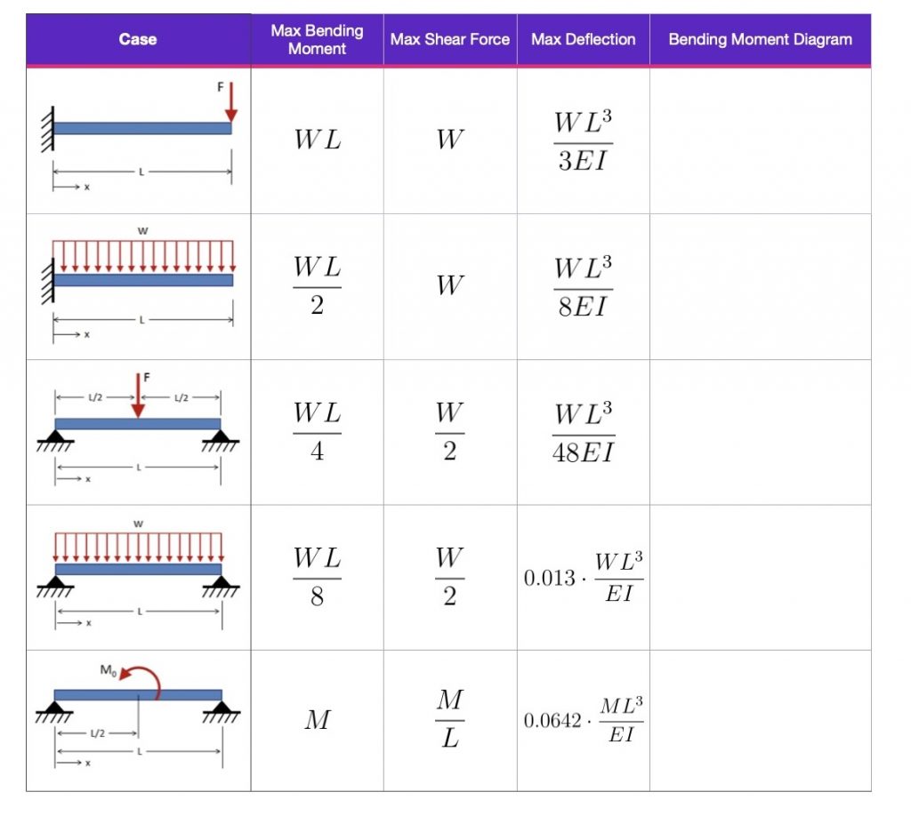 The equations below can be used as a quick reference for other simple beam cases for calculating maximum bending moment and shear loads.