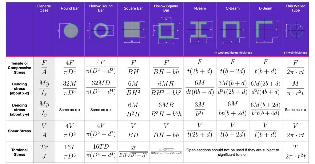 We would recommend to complete calculations with forces in N (newtons) and distance in mm (millimetres) resulting in stresses calculated in MPa (Mega Pascals). You may choose to make your calculations in m (meters), either way it is critical to keep all units consistent across all calculations to ensure no mistakes are made!