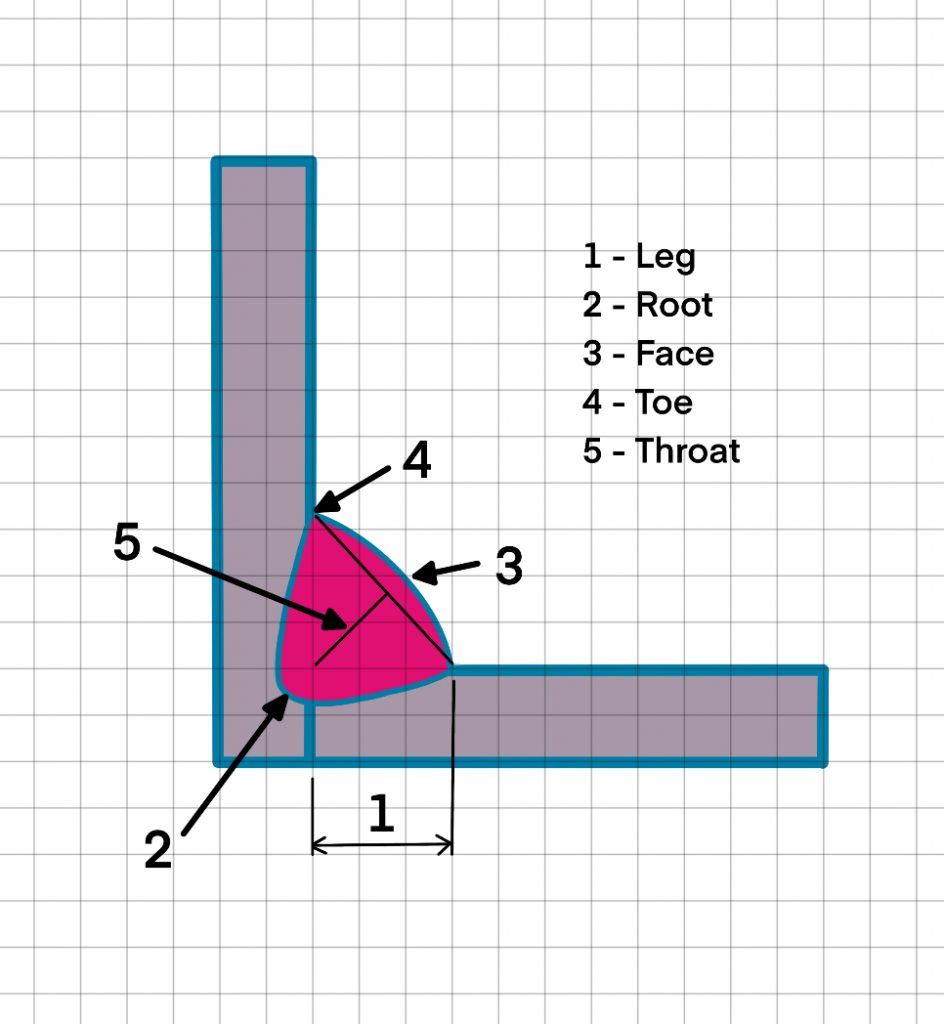 The critical dimension of a fillet weld is the throat (t). However in some standards a fillet weld can be described by its leg length (s).