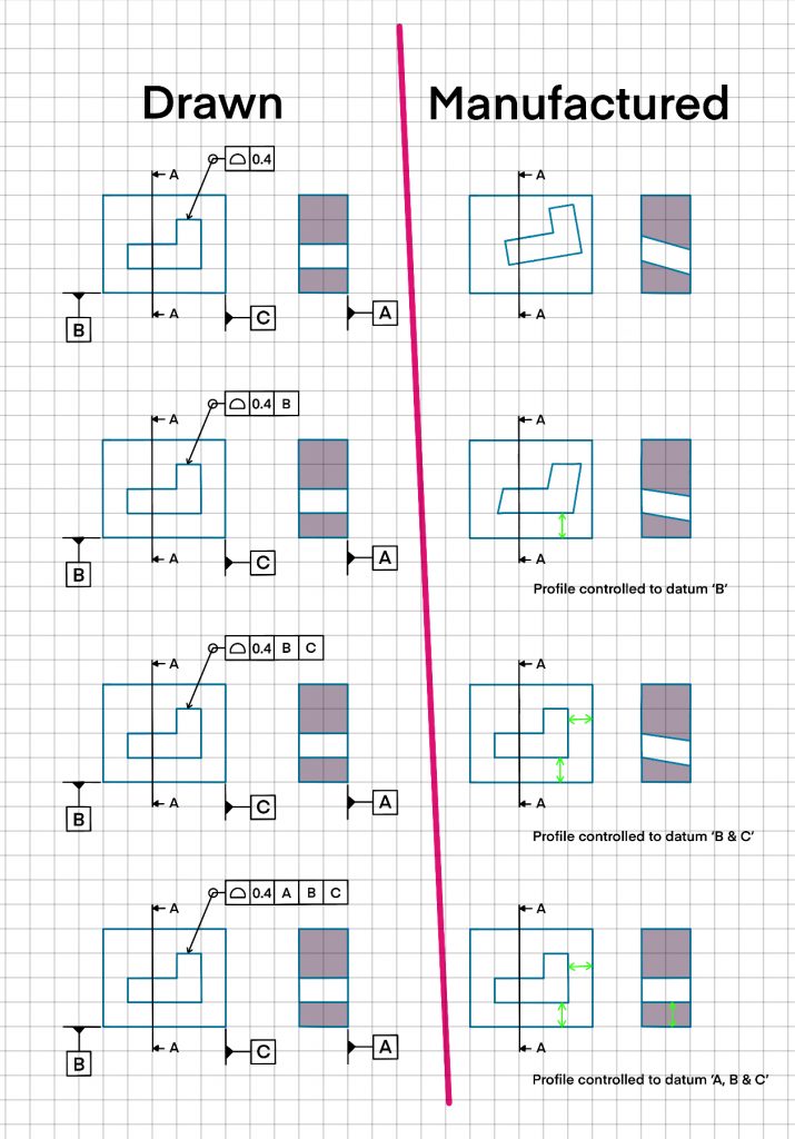 In both cases, profile tolerances only control the form of a feature. To control the feature’s orientation or location, datum features must be called out in the tolerance frame. In the examples below, all four examples would pass inspection!