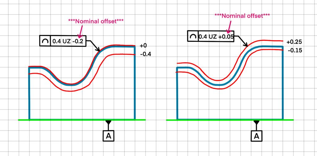Unlike all the other geometric tolerances we have spoken about profile tolerances can be applied as a nominal tolerance zone (bi-lateral, equal both sides), a biased tolerance zone (unilateral) or a variable tolerance zone (unequal offset to nominal).