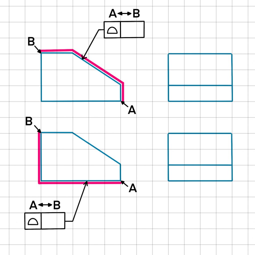 The leader line position between points A & B stated the features which are to be controlled. Controlled features highlighted in both case.