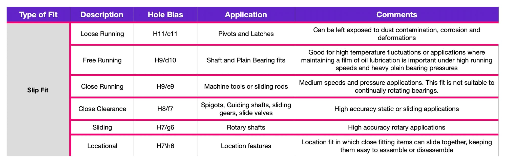 Slip fits or sometimes referred to as clearance fits come in 6 sub-categories: loose running, free running, close running, sliding, close clearance and locational clearance. For all these fit types, the shaft is sized smaller than the hole size.