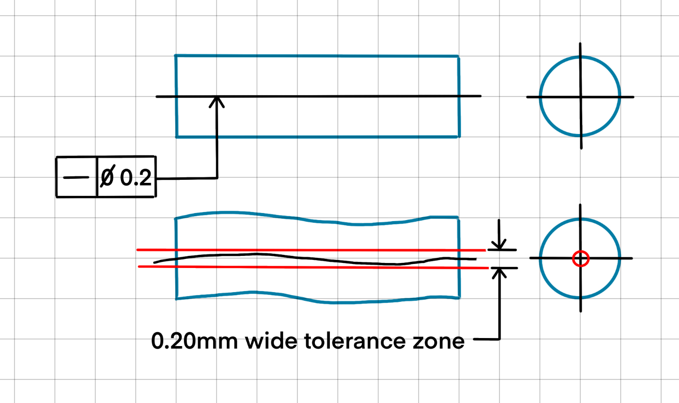 Straightness can be defined in two ways; a 2D tolerance zone bounded by two parallel lines, typically applied to an edge or surface, or a 3D tolerance zone bounded by a cylinder, when applied to an axis.